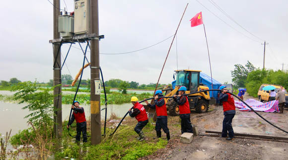 reinforcing power lines against floodwaters in Ezhou, Hubei